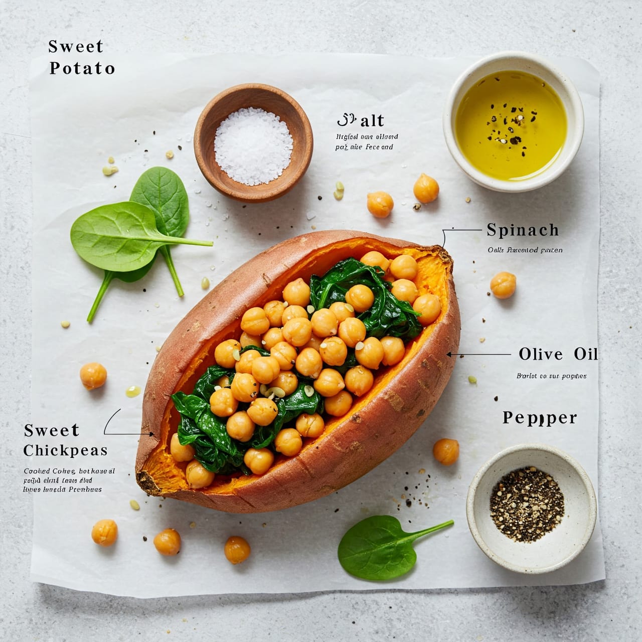 Tags: baked sweet potato, chickpeas and spinach, healthy vegetarian meal, plant-based dinner, vegan sweet potato bowl, gluten-free recipe, hearty veggie dinner